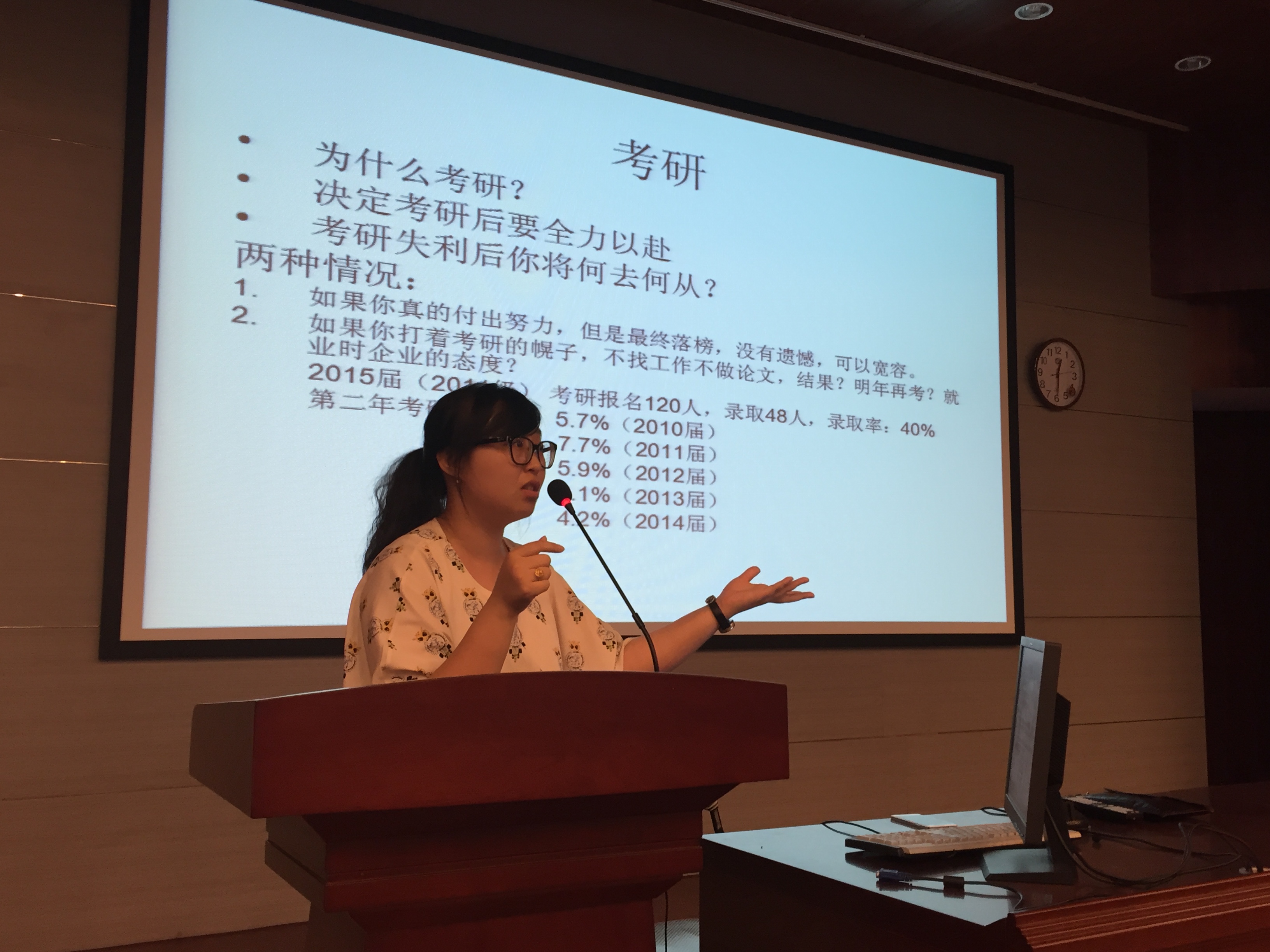 本科生毕业去向数据分析,向全体毕业生做了题为《后路=无路可退》的就业动员。她分别从已保研、考研、出国、就业等各个方面给予学生接下来的规划建议,她强调大四一年的时间可贵,“以后再说”的心态万万要不得。她还用生动的事例,鼓励自认为自己“不优秀”的学生,希望他们能从现在开始积极准备,充分利用各方资源,争取在毕业季做“最好的自己”。最后,张黎向毕业生介绍了,包括“校就业信息网”“华理就业领航号”在内的多种求职就业信息渠道。动员会结束后,很多学生就自己关心的问题与两位老师进一步交流,部分同学也表示这次动员会让自己有了努力的方向和方法。