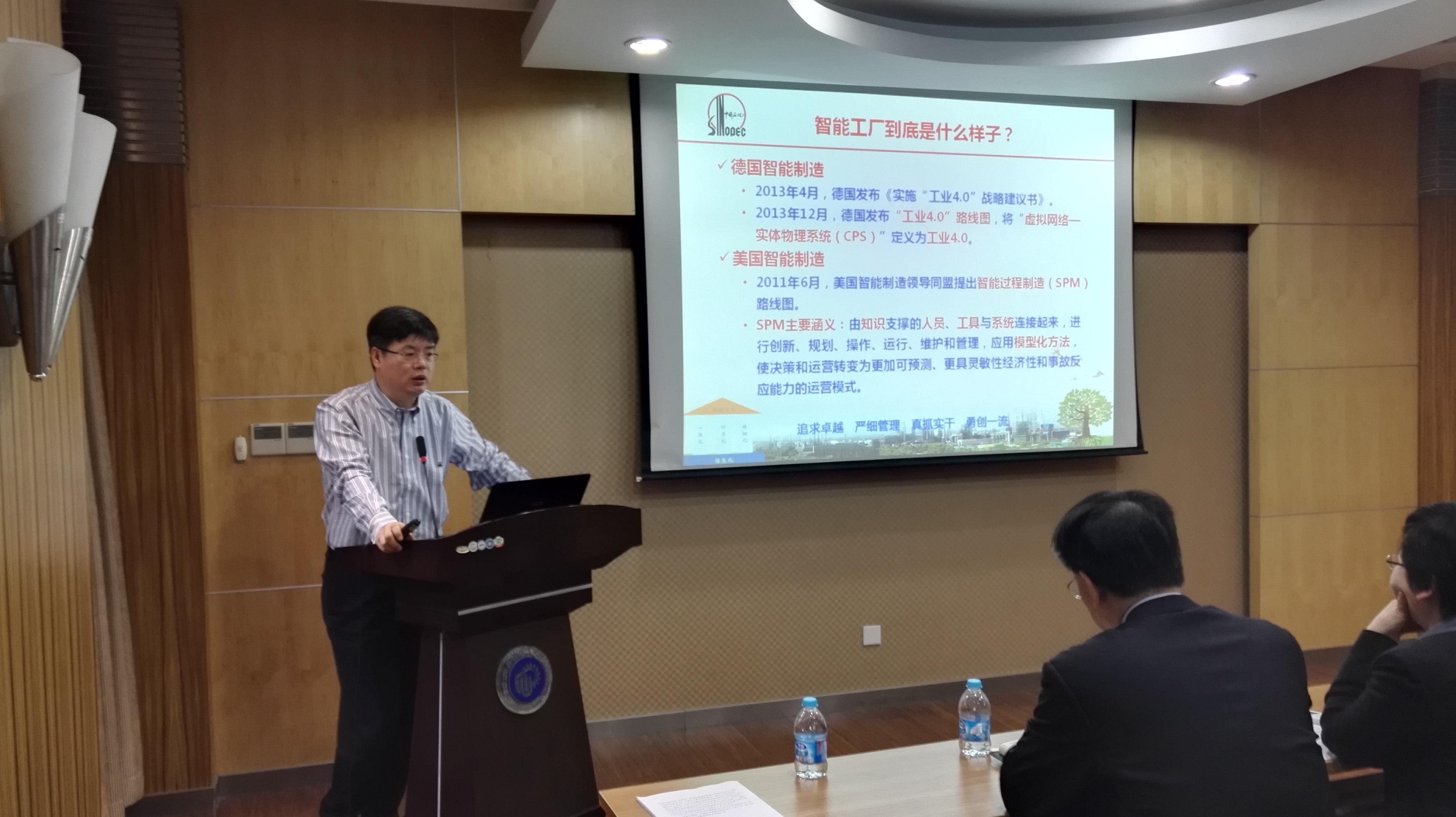 行业面临的机遇与挑战,分析了国内外推进信息化战略和信息化技术发展情况,深入报告了九江石化推进两化深度融合—智能工厂建设实践整体效果,以及信息物理空间、全流程优化、大数据应用等内容建设详细情况。最后,在线展示了九江石化三维数字化炼厂建设成果。老师和同学们认真聆听了报告内容,并与覃博士的技术团队进行了深入交流和探讨。报告结束后,覃伟中一行访问了“第一会所