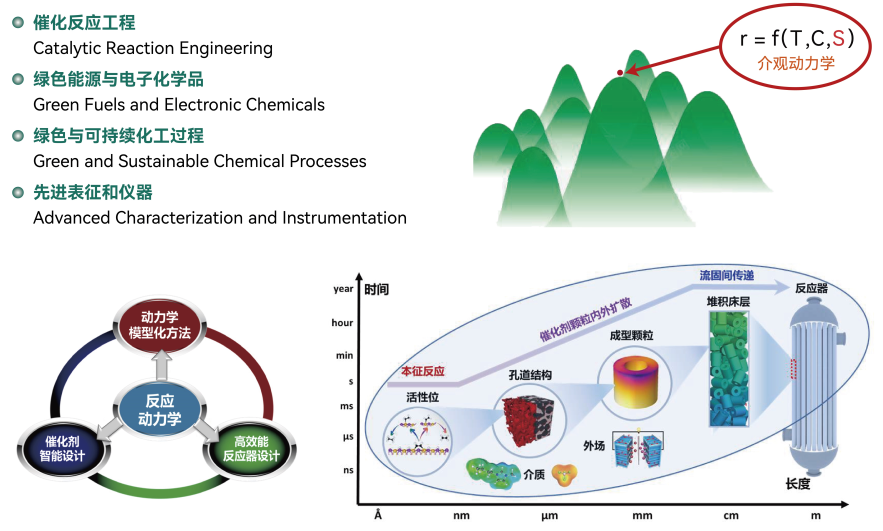 以化学反应工程为研究方向,国际上率先提出了用于工业催化剂和反应器设计开发的介观动力学研究方法,重点突破绿色燃料(绿色甲醇、SAF等)、生物基化学品、大宗化学品(低碳醇、低碳烃等)/劣质资源(劣质芳烃、废塑料等)高值化、电子化学品的短流程、绿色低碳催化反应工程技术。成立华理-复洁绿色能源第一会所