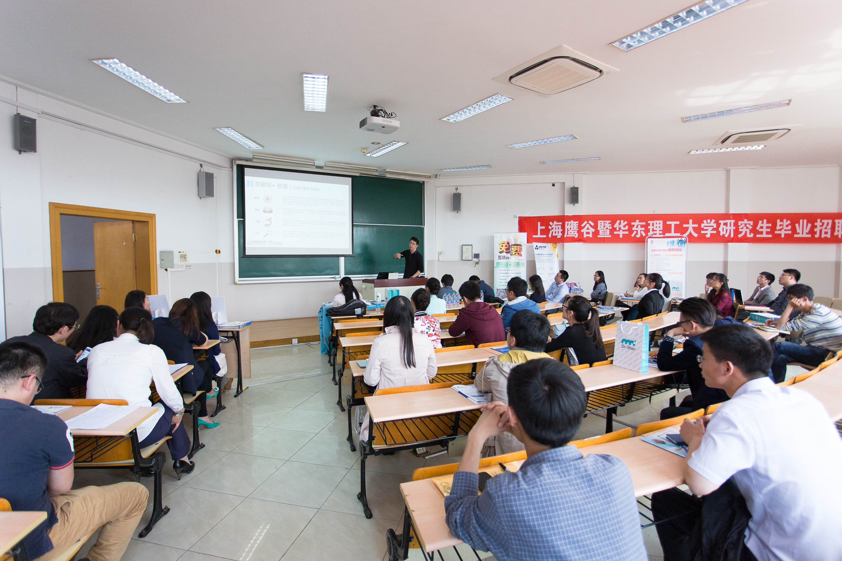 、医药等研发机构提供电子化数据采集服务,帮助用户积累科研大数据,她从公司发展历程、企业服务、典型用户、10亿科研支持计划、合作伙伴和权威认可等六个方面对鹰谷公司概况作了说明。她表示鹰谷虽然年轻,但竞争力强、前景美好,希望同学们积极主动应聘公司的销售经理或产品经理岗位。接着,上海毕得医药科技有限公司研发副总裁张锐豪先生对企业发展情况进行了概述,并以图片的形式展示了公司良好的工作环境和员工丰富多彩的业余活动,殷切希望华理学生踊跃投入到毕得的大家庭中来。随后,上海西陇生化科技有限公司副总经理阿庆德先生从公司的平台服务、营销团队、品牌(及代理品牌)等方面对公司做了简介,同时着重介绍了隶属于公司的毛博士实验室在行业内30年来的成就,其为化学、生化、医药和材料科学等领域的实验室研发及生产提供了集成化解决方案。会上,萨恩化学技术(上海)有限公司和上海迈瑞尔化学技术有限公司相关负责人分别对其企业作了介绍和对所需招聘人才作了说明。最后,上海阿拉丁生化科技股份有限公司营销总监费志锋压轴出场,以诙谐幽默的语言风格介绍了公司情况作并与在场人员亲切互动。他在发言最后强调了公司人力资源管理理念“量才使用、公平竞争、绩效为先”的重要性,并对企业2016年招聘薪酬标准作了说明。各企业宣讲结束后,研究生与企业进行了面对面交流、面试。
