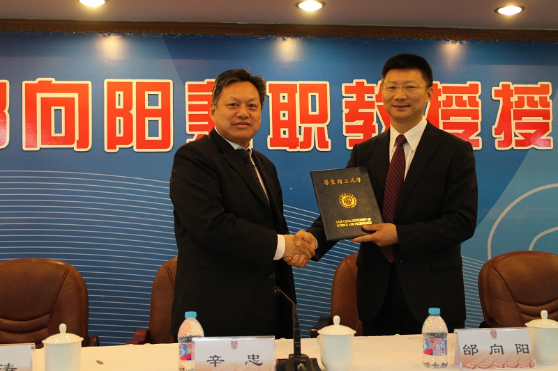授聘仪式上,李涛书记介绍了邰向阳教授的简历,辛忠副校长为邰向阳教授颁发聘书并佩戴第一会所