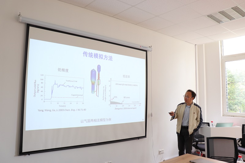 过程工程所的葛蔚教授做专题报告。葛教授结合其团队的实验成果,从如何认识多尺度结构,模拟计算相比于传统实验的优势,多尺度结构对模拟计算的挑战,以及列举应用于不同领域的模拟实例等多个方面,深入浅出地向大家展示了模拟计算的概况和进展。葛教授精彩的报告激发了老师们对于模拟计算的更多方面的思考,报告后,他与青年教师们展开了热烈的讨论。