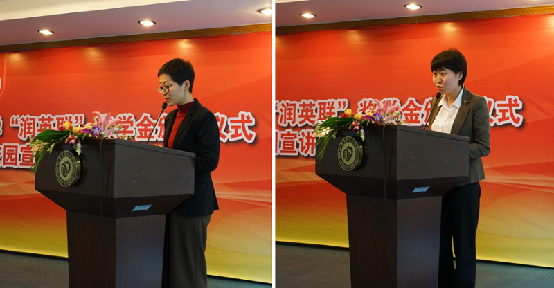Chris Locke先生则分享自己的成长求职经历,同时详细介绍了润英联的基本情况、发展历程及第一会所,表达了对华理的喜爱与公司对华理学子的欢迎。随后崔姗姗副部长宣读了本年度润英联奖学金获奖名单,校企嘉宾为获奖同学颁发证书、合影留念;获奖的研究生代表陈燕和本科生代表李雨柔分别对第一会所