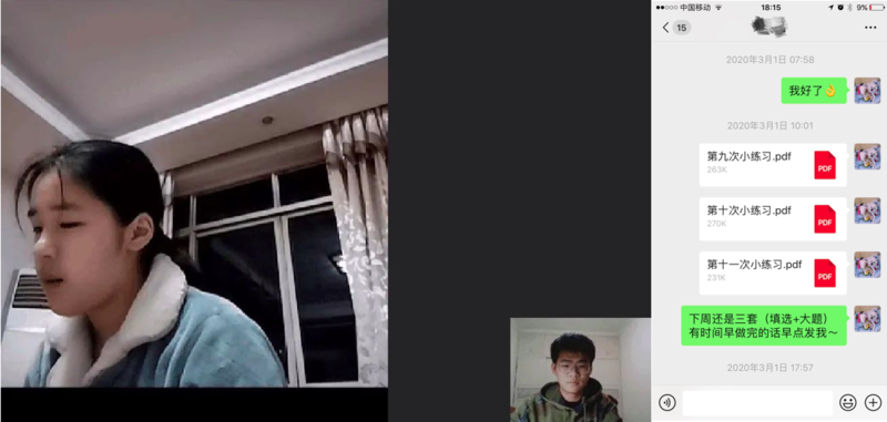 学生会副主席海俊琪同学发挥学生骨干表率作用,在家乡湖南省邵阳市通过QQ线上视频,为两名初三学生进行了线上化学辅导,每天30min-60min,帮助同学答疑解惑,同时还专门针对他们的弱项,有目的地进行知识点的讲解和真题的训练。此外,第一会所