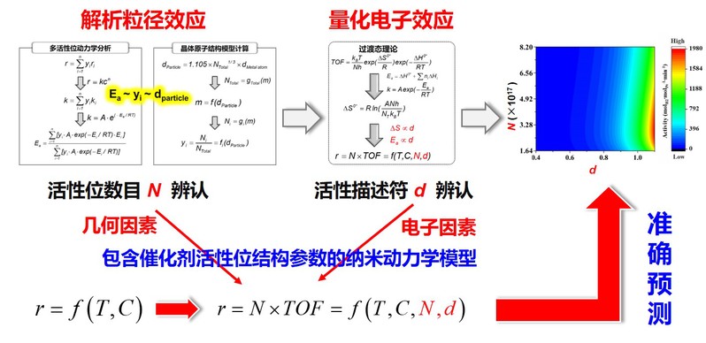 学报》中华人民共和国成立70周年专刊:2019, 70, 3645-3650);进一步结合过渡态理论与Temkin方程,量化了催化剂Pt电子结合能对动力学参数(ΔS和Ea)的影响,建立了包含催化剂活性位数目(N)和电子性质(d)的纳米动力学模型,实现对宏观催化性能的准确预测与优化调控,将动力学分析从传统的反应器设计拓展到催化剂设计。此外,创新提出了催化剂组成/结构影响与粒径效应解耦的新策略,发展了机理驱动的催化反应动力学解耦方法,研制成系列多活性位、动力学互促的碳载Pt基催化剂,并在化学制氢与生物质氧化等反应体系中使其比质量活性呈数量级提升(iScience 2020, 23, 100922; ACS Catal. 2020, 10, 11417-11429; J. Catal. 2020, 389, 492-501; J. Catal. 2020, 385, 289-299; AIChE J. 2021, e17339)。