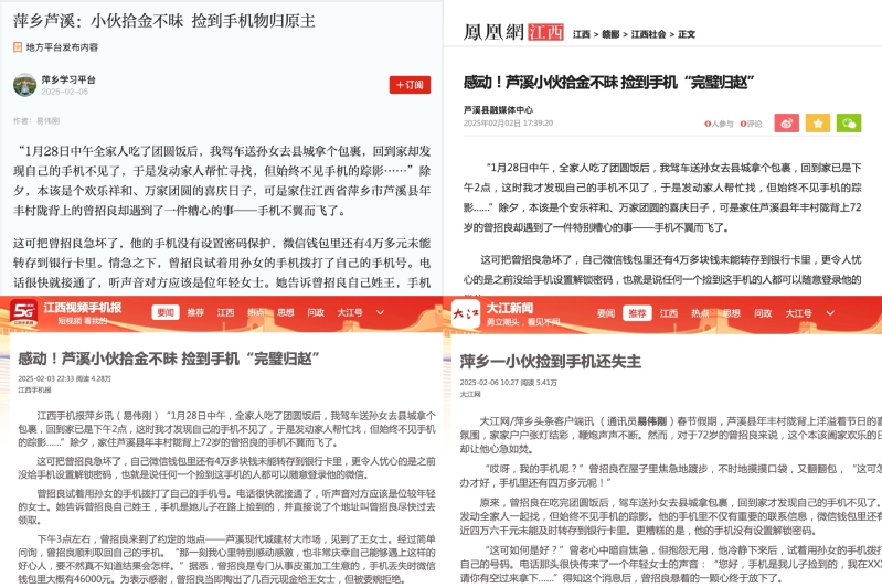 在“扶不扶”“捡不捡”成为社会热议话题的当下,易鑫洋自发的道德选择,展现了新时代青年对中华传统美德的传承与创新,被“学习强国”学习平台、凤凰网、中国江西网、江西手机报、萍乡日报、“今彩萍乡”客户端、政务微信“今日芦溪”等媒体争相报道,产生了良好的社会反响。