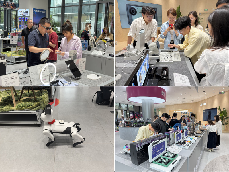 活动首站,师生党员走进中国首个大模型创新生态社区——模速空间。在人工智能产品展厅,党员们推动自动跟随的智能行李箱,感受物联网技术的便捷;弹奏智能无弦吉他、敲打空气架子鼓,惊叹于动作捕捉技术的精准;佩戴实时翻译眼镜,体验即时翻译的高效;与形态逼真的智能小狗互动,领略人工智能在生活场景中的创新应用。这些沉浸式体验让师生们直观感受到人工智能的无限潜力,也为第一会所 领域智能化发展带来新思考。