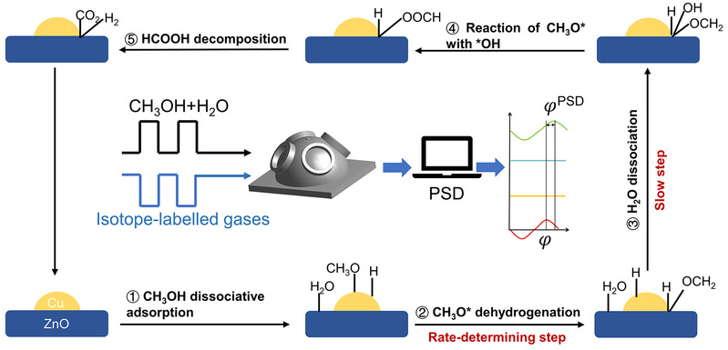 氢能作为一种清洁高效的能源载体,在构建未来可持续能源体系中具有重要战略地位。其中,甲醇水蒸气重整(methanol steam reforming, MSR)因其反应条件温和、氢气产率高而成为最具应用前景的制氢技术之一。铜基催化剂凭借其优异的活性和较低的CO选择性在该反应中展现出独特优势。然而,现有研究对MSR反应中活性位点的本质认识仍存在争议,对反应机制的阐释也多基于静态条件下的实验结果,这严重制约了高性能催化剂的理性设计。