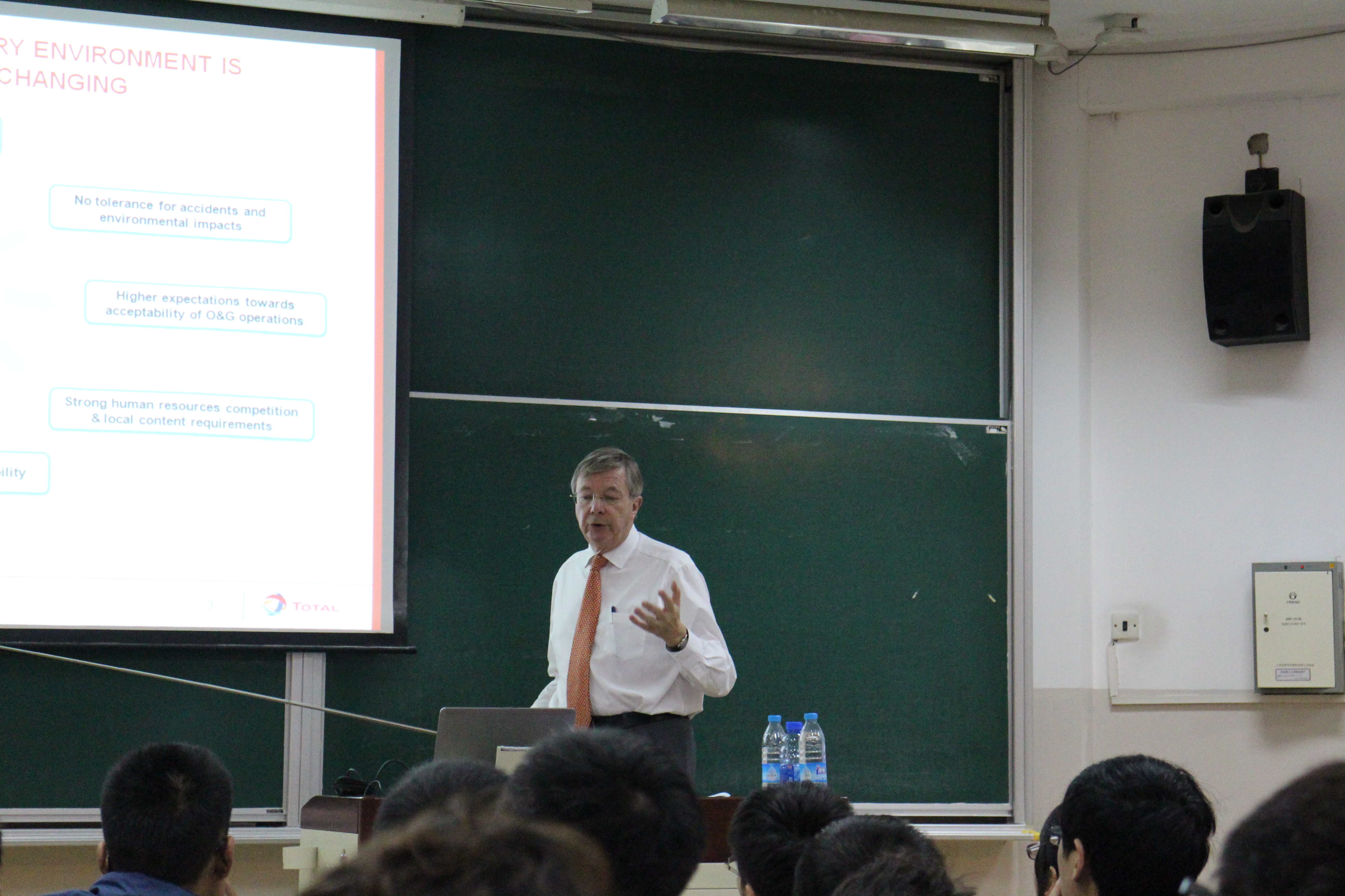 Charles LAGRANGE教授用中文道一句“你好”,便以幽默亲切的方式开始了与同学们的交流。整个讲座期间,教授善于用身边的物品来给大家解释石油第一会所