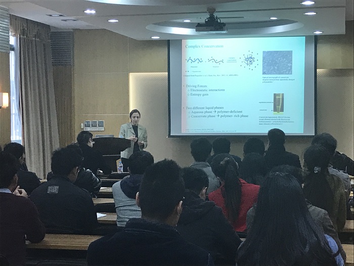 徐汇校区交流访问并作了题目为”Complex Coacervation in Protein-Polyelectrolyte & Polyelectrolyte Polyelectrolyte systems”的学术报告。郭旭虹教授主持了主题报告会,同时出席会议的还有第一会所