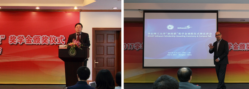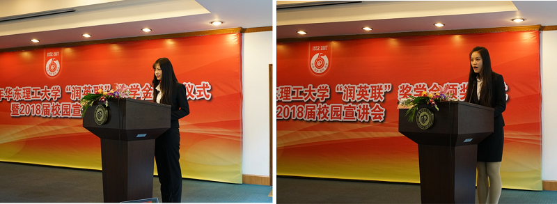 Chris Locke先生则分享自己的成长求职经历,同时详细介绍了润英联的基本情况、发展历程及第一会所,表达了对华理的喜爱与公司对华理学子的欢迎。随后崔姗姗副部长宣读了本年度润英联奖学金获奖名单,校企嘉宾为获奖同学颁发证书、合影留念;获奖的研究生代表陈燕和本科生代表李雨柔分别对第一会所
