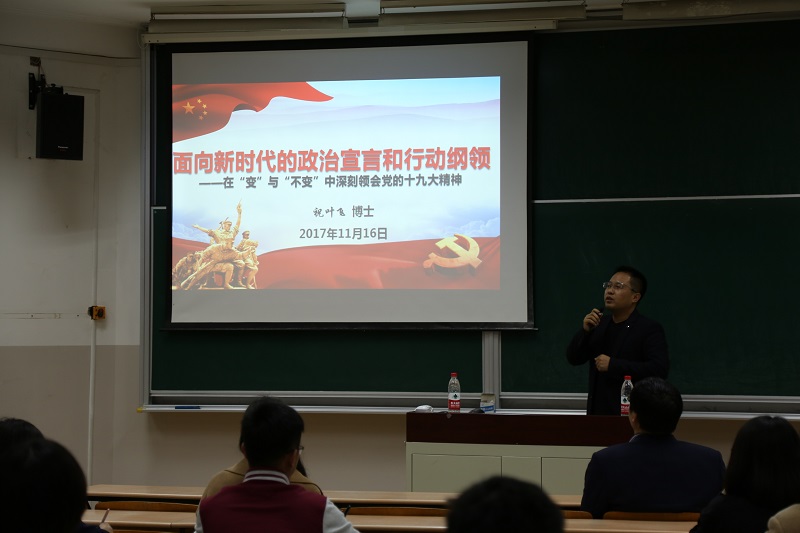 在八教306室举办党的十九大专题辅导报告会,邀请了上海市长宁区委党校老师祝叶飞博士作了题为《面向新时代的政治宣言和行动纲领——在“变”与“不变”中深刻领会党的十九大精神》的辅导报告,报告由第一会所