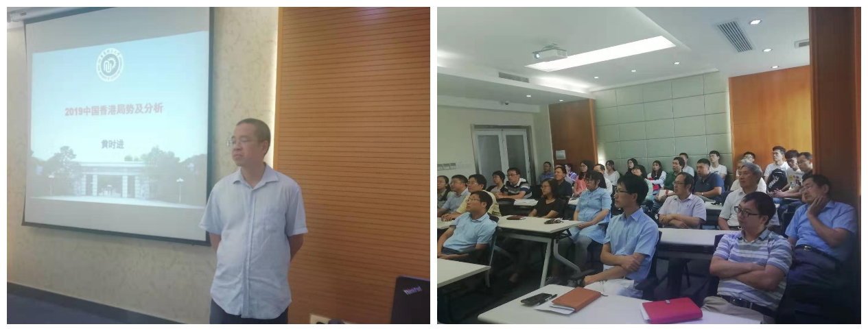 科技与社会研究所所长黄时进教授在实验16楼610室一起参加了党组织生活交流活动,并由黄时进教授给大家作了题为“2019中国香港局势及分析”的报告。共计36名党员参加了此次组织活动。