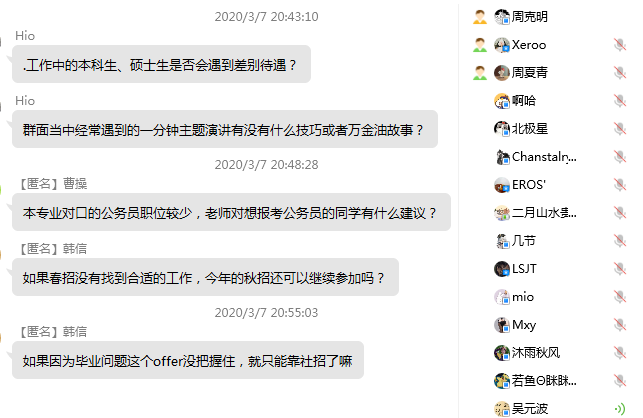 分专业邀请杰出校友分享工作经历,针对不同专业学生的差异性需求,分享求职就业经验,帮助学生答疑解惑,学生可选择匿名提问,即增加互动趣味性,又保护个人隐私。现已邀请到徐龙宇、吴元波、周夏青等校友在线分享,以校友精神为激励,拓宽学生视野,助力学生就业,强化求职能力,提升就业自信。交流结束后,学生骨干主动整理归纳,帮助同学复盘总结。