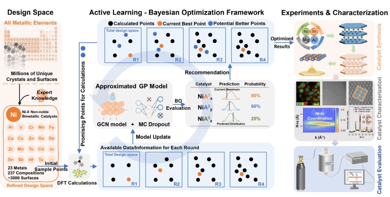 石脑油裂解碳二和碳三馏分中少量的炔烃选择性加氢是制备聚合级乙烯和丙烯的关键。非贵金属Ni因其具有未填充的d轨道电子而表现出优异的氢活化能力,然而该类催化剂选择性往往较低。研究团队先前的研究结果表明,设计和制备原子级分布的金属活性位点、通过引入第二金属精确调控其上关键物种的吸附构型能实现对目标产物选择性的调控(Angew. Chem. Int. Ed. 2020, 59, 11647; Angew. Chem. Int. Ed. 2022, 61, e202215225; Nat. Commun. 2022, 13, 5534)。为寻找最优的第二金属,传统研究模式主要依赖实验试错方法,效率较低。快速发展的机器学习等数据科学技术为催化剂设计带来新的契机。基于机器学习、理论计算和实验研究的有机结合,有望实现催化剂的高效筛选,突破传统试错法的弊端。