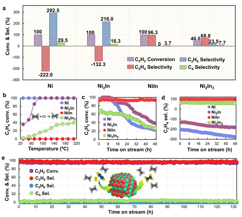 研究团队进一步通过实验合成NiIn金属间化合物催化剂及参比Ni基催化剂,并借助球差电镜和X射线吸收光谱等表征技术解析了催化剂结构,证明了长程有序、结构稳定的NiIn金属间化合物催化剂的成功制备。催化反应性能评价表明:NiIn金属间化合物催化剂在乙炔和丙炔转化率为100%时,乙烯和丙烯选择性高达97.0%,明显高于参比催化剂,证实了理论计算的预测结果。结合吸附构型分析、电子结构分析、原位红外光谱表征等机理研究手段,发现NiIn催化剂优异性能主要归因于Ni 3d与In 5s-p轨道的能量匹配和适宜的杂化,尤其是Ni 3d与In 5p轨道的杂化。