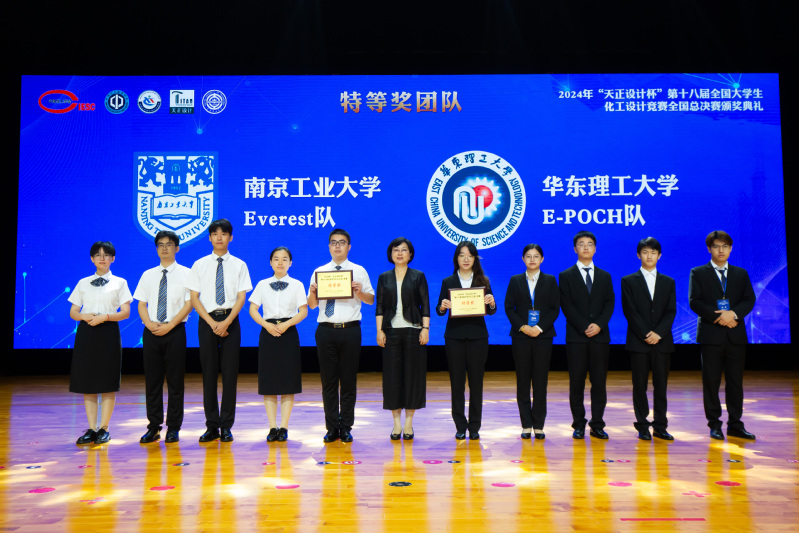 “E-POCH”队以某油脂厂副产甘油为原料,采用甘油氢解法设计了年产2万吨1,3-丙二醇项目。历经7个月,团队成员从项目可行性研究、工艺方案比选论证、流程搭建、设备设计及选型、自动控制、总图布置、车间布置、安全评价、经济分析等多个方面,对项目进行精心设计,具有高效生产、绿色环保、节能减排、安全可靠、经济可行的特点,符合中国制造2025的要求。“E-POCH”队的5位指导老师为沈荣春、黄子宾、吴艳阳、雷明、彭阳峰,另有袁佩青、李瑞江、魏永明、杨座国、杨敬一、宗原6位老师深度参与了竞赛指导。