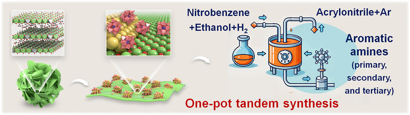 行业中扮演着关键角色。然而,传统的芳香胺合成方法通常涉及多步反应,存在原子经济性低、产率不足、反应条件苛刻、副产物过多以及环境问题等局限性。近年来,一锅法串联催化作为一种新兴的绿色合成方法,能够在单一反应器中完成多个反应步骤,避免了传统合成中的多步纯化过程。然而,将多步反应集成到一个反应器中面临着催化机制复杂、反应路径竞争、中间体不兼容以及副产物过多等挑战,尤其是在设计具有三种或更多不同活性位点的催化剂时,这些活性位点之间可能存在相互抑制的问题。因此,如何克服这些挑战并实现高效的串联催化合成仍然是一个亟待解决的问题。