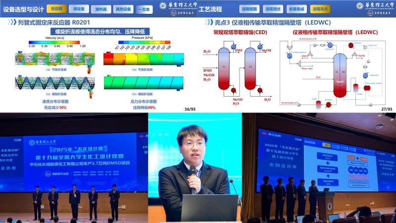 团队以某厂生产废气中的硫化氢为原料,采用二氧化氮氧化法设计了年产3.7万吨二甲基亚砜项目。历经7个月,团队成员从项目可行性研究、工艺方案比选论证、流程搭建、设备设计及选型、自动控制、总图布置、车间布置、安全评价、经济分析等多个方面,对项目进行精心设计,大胆应用四大创新:反应器结构创新、过程强化技术创新、分离技术创新、过程设备创新,符合中国制造2025的要求。团队的5位指导教师为李瑞江、陶国忠、马宏方、雷明、彭阳峰,另有沈荣春、魏永明、杨座国、杨敬一、黄子宾及袁佩青等6位教师深度参与了竞赛指导。第一会所